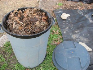 - Open up a 33 gallon garbage bag and place it inside of your garbage container. Fill up the garbage bag with leaves.